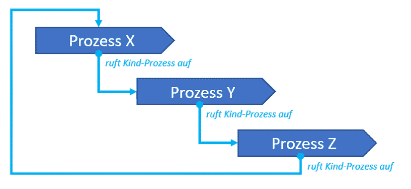 Prozesse haben die Fähigkeit, andere Prozesse aufrufen zu können. Aus diesem Grund lassen sich in Prozessen sogenannte Eltern-Kind-Beziehungen herstellen und über diese lassen sich auch größere Sprünge in der Detaillierung erklären. Ein Prozess mit wenig Details kann einen Prozess mit vielen Details aufrufen. Und der aufgerufene Prozess kann wiederum einen anderen oder sogar theoretisch seinen eigenen Elternprozess aufrufen, und ihn so zu seinem Kind-Prozess machen. Es ergibt sich also eine Aufrufhierarchie. Als Prozessarchitekt sollten sie Aufwand investieren, dass diese Aufrufhierarchie logisch und stringent ist (Abbildung 1).