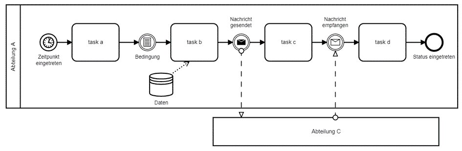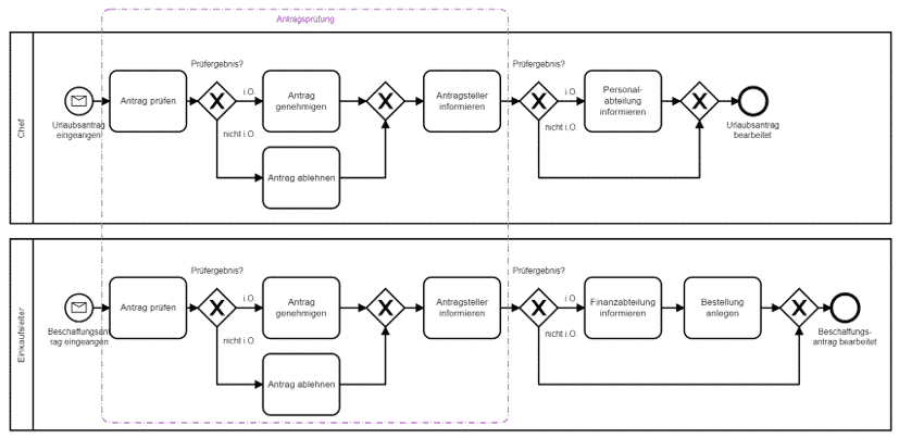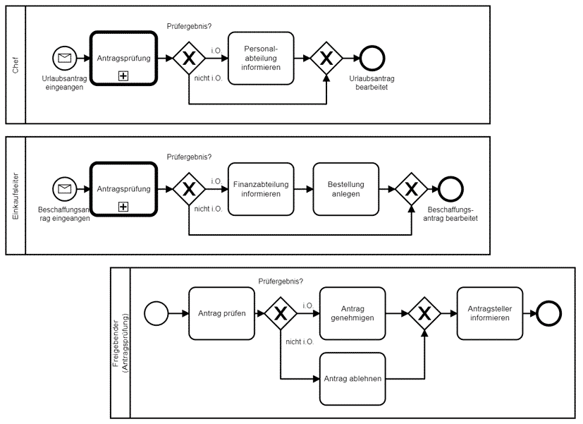 Die Abbildung 8 zeigt, dass in zwei Prozessen im Grunde dieselbe Sequenz von Aktivtäten stattfindet. Es erscheint also ein geeigneter Kandidat für Wiederverwendung zu sein. Im nachstehenden Modell (Abbildung 9) lagern wir diese Schritte daher aus und binden sie über eine BPMN Aufrufaktivität nur noch ein. Es fällt auf, dass die Rolle (Poolbezeichnung) abstrahiert wurde und nun von einem ‚Freigebender‘ gesprochen wird.