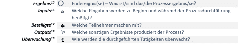 Aus unseren Erfahrungen heraus, haben wir eine Prozess-Steckbrief-Vorlage erstellt. Dieser kann ein wichtiges Hilfsmittel für die Vorbereitung und Durchführung von Prozess-Workshops sein. Er umfasst 25 Attribute, die über das eigentliche BPMN-Modell hinausgehen. Jedes Attribut wird mit erklärenden Fragen ergänzt. Wenn wir einen Workshop durchführen, markieren wir beispielsweise die Informationselemente gelb, an denen wir Interesse haben.