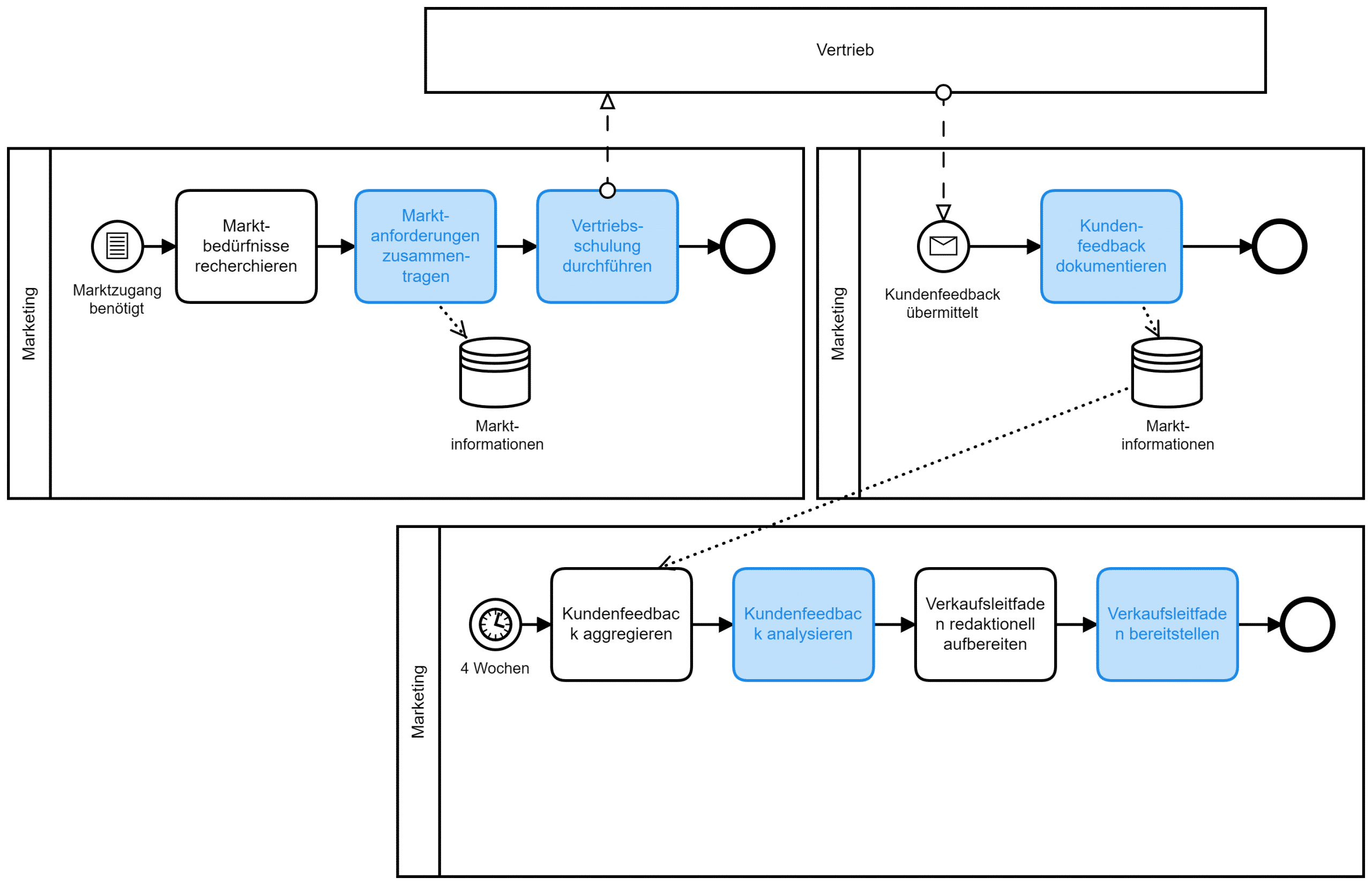 Marketingprozess: Für die Bearbeitung eines neuen Marktsegmentes muss Wissen erworben werden. Entsprechende Aktivitäten wie “Marktbedürfnisse recherchieren” (Wissenserwerb) gehören demnach zum Prozess. Die Ergebnisse der Recherche müssen gesichert werden. Eine entsprechende Dokumentation mithilfe der Aktivität “Marktanforderungen zusammentragen” (Wissenssicherung) sollte daher ebenfalls Eingang in den Prozess finden. Um den Marktangang skalieren zu können, müssen anderen Markt-bearbeitende Einheiten von diesem Wissen erfahren (das Wissen muss transferiert werden). Hierzu können interne Marketing- und Vertriebsschulungen prozessual mithilfe einer Aktivität “Vertriebsschulung durchführen” (Wissenstransfer) verankert werden. Die Erfahrungen, die in allen Bereichen mittels “Kundenfeedback dokumentieren” gesammelt und kodifiziert wurden (Wissenssicherung), werden auf ihre Nützlichkeit durch die Aktivität “Kundenfeedback analysieren” bewertet (Wissensbewertung) und mittels “Verkaufsleitfaden bereitstellen” allen zur Nutzung wieder zur Verfügung gestellt (Wissenstransfer).